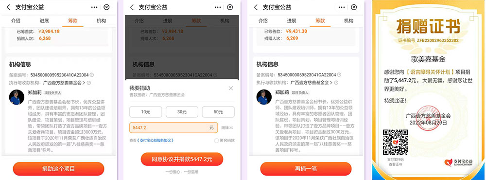 捐赠:歌美嘉于2022年8月29日进行了周年庆的公益捐赠,奉献自己爱心的同时,也帮助众多家长朋友达成心愿。行善积德。